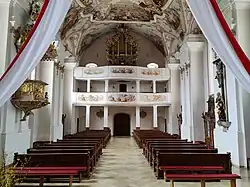 Die Orgel auf der oberen von zwei Emporen im hinteren Teil der Kirche wurde 1767 von Johann Konrad Funtsch aus Amberg gebaut, sie ist eines seiner größten Werke, insgesamt sechs davon sind noch erhalten. Das Instrument hat 16 Register auf zwei Manualen und Pedal. Alle Holzregister sind überkommen, die Metallregister bis auf Mixtur minor, Gamba und Salicional. Das Principal 8′ wurde im Ersten Weltkrieg nicht eingeschmolzen. Der Umfang der Manualwerke und des Pedals sowie die Spieltraktur sind fast unverändert erhalten. Eine grundlegende Restaurierung führte 1972 die Firma Klais Orgelbau durch. 2004 nahm Orgelbau Kuhn eine Revision vor.[1][2] Die heutige Disposition lautet: