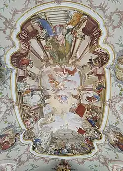 Über der Orgelempore am unteren Rand des von J.M. Wild geschaffenen Deckenfreskos findet sich – im Vergleich mit dem gegenwärtigen und vollkommenen Waldbewuchs des Kirchberges – eine dramatische Darstellung der „Totalentwaldung des nach Nordwest, Westen und Süden exponierten Habsbergs“ in der zweiten Hälfte des 18. Jahrhunderts.[3]