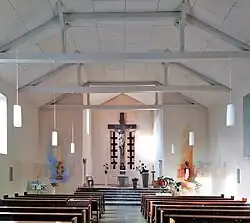 Die schlichte Saalkirche im Stil der Neuen Sachlichkeit wurde nach den Plänen des Architekten Wilhelm Buchholz aus Trier errichtet und besitzt einen rechteckigen Grundriss mit angefügtem Chorraum. Zur Straße hin wird das Gebäude durch einen Westriegel abgeschlossen, aus dem sich im Norden ein mit einem flachen Satteldach gedeckter Glockenturm erhebt. Die weiße Fassade wird von einem mächtigen Steinkreuz über den beiden Kirchenportalen geschmückt, welches das Westfenster in vier Teile teilt. Im Innern öffnet sich ein schlichter heller Raum, der von einem teilweise offenen Dachstuhl aus hellen Holzbalken überspannt ist. An jeder der beiden Seiten befinden sich je vier rechteckige Fenster.[2][3]