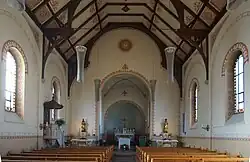 Das Doppelflügelportal aus Eichenholz ist mit geschmiedeten Beschlägen aus geschwungenen Blattranken verarbeitet. Wie aussen sind auch im Inneren die Raumwände in Joche unterteilt. Die Lisenen bilden grosse, zum Dachfuss reichende Blendbogen und mit den fünf Bogenbindern des offenen Dachstuhls unterstreichen sie die jochweise Raumgliederung. Die auf langen Stichbalken ruhenden Binder, mit geschwungenen Knaggen laufen in der Kämpferzone der Fenster aus. Der eingezogene Chor hat ein Kreuzgratgewölbe und eine Apsis mit einer abschliessenden Kalotte.