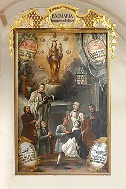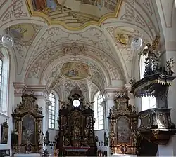 Die Deckengemälde von Johann Hell aus Göggingen bei Augsburg entstanden um 1730. Im Gewölbe des Chors ist die Verkündigung der Geburt Jesu entsprechend dem Evangelium gemalt, nach dem Erzengel Raphael der Maria sagt, sie werde ein Kind gebären, das „Sohn des Höchsten“ genannt werde. (Lk 1,26–38 ) Hauptthema des Gemäldes über dem Mittelschiff ist Mariä Himmelfahrt.