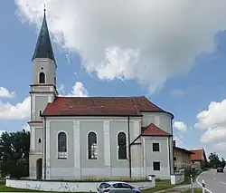 Die spätbarocke Saalkirche wurde in den Jahren 1726 bis 1728 nach einem Entwurf von Domenico Mazio erbaut. Sie besteht aus dem Langhaus, dem eingezogenen, halbrund geschlossenen Chor im Osten, einer Sakristei mit Oratorium im Obergeschoss an der Südwand des Chors und dem Fassadenturm im Westen, dessen achteckiges oberstes Geschoss mit dem Helm 1843 ergänzt wurde, nachdem in einem nahe gelegenen Bauernhof Feuer ausgebrochen war und auch den Kirchturm erfasst hatte.