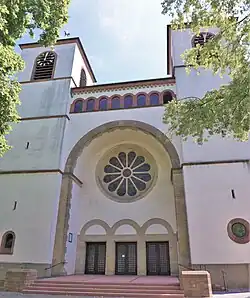 - Über dem mittleren Kirchenportal wurde ein Stein aus der Heiligen Pforte des Petersdomes eingesetzt, den Prälat Ludwig Kaas der Pfarrei im Heiligen Jahr 1950 stiftete.