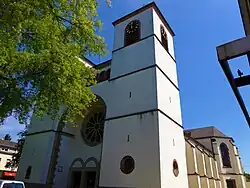 Die beiden etwa 30 Meter hohen neoromanisierenden Kirchtürme der 1950er Jahre flankieren das dreiteilige Hauptportal der Kirche. Im linken Turm befindet sich das Uhrwerk, wobei beide Kirchtürme jeweils mit drei Zifferblätter ausgestattet sind. Im rechten Turm befinden sich alle sechs Glocken, welche das Geläut mit dem größten Gesamtgewicht (12.150 kg) im gesamten Saarland bilden. Die Glocken wurden im Jahr 1954 von der Saarlouiser Glockengießerei in Saarlouis-Fraulautern, die von Karl (III) Otto von der Glockengießerei Otto in Bremen-Hemelingen und dem Saarländer Alois Riewer 1953 gegründet worden war, gegossen.[44][45]