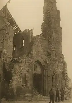 Während des Ersten Weltkrieges musste die Pfarrgemeinde im Jahr 1917 ihre Kirchenglocken und Orgelpfeifen zum Einschmelzen abgeben. Im Jahr 1925 wurden neue Glocken im Kirchturm aufgehängt. Während des Zweiten Weltkrieges mussten diese Glocken im Juni 1942 wiederum zu Kriegszwecken abgegeben werden. Ebenso wurden im August 1943 insgesamt 23 Leuchter und der Gong zum Einschmelzen abgegeben. Zwischen Pfarrer Jakoby und dem Rodener Rektor Wagner gab es zahlreiche Spannungen hinsichtlich der nationalsozialistischen Gleichschaltung der Rodener Jugend. Während der schweren Kämpfe zwischen der Deutschen Wehrmacht und der US-Armee im Winter 1944/1945 wurde der Rodener Kirchturm am 9. Dezember 1944 derart beschossen, dass er in sich zusammenstürzte. Die Amerikaner hatten einen deutschen Beobachtungsposten im Turm vermutet. Erst am 16. März 1945 endete der Häuserkampf in Roden. Fast 90 % der Häuser Rodens, die Kirche und das Pfarrhaus waren zerstört, sodass der in den Jahren 1945–1947 entwickelte sogenannte Menkes-Plan (nach dem französischen Städteplaner Edouard Menkes, 1903–1976)[22] vorsah, Roden als Ort vollkommen aufzugeben und an seiner Stelle ein Industriegebiet zu erstellen. Über 460 Rodener Männer waren als Soldaten im Krieg getötet worden, 140 galten als vermisst, etwa 100 zivile Opfer waren zu beklagen. Des Weiteren starben noch zahlreiche Rodener nach der Einstellung der Kriegshandlungen durch die Detonation von Sprengkörpern.[23]
