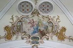 Der Stuckdekor mit aufwändigen Muschelwerkkartuschen wird um 1767 datiert und Bartholomäus Hoiß zugeschrieben. Die Inschriften in den beiden Stuckkartuschen am Chorbogen weisen auf die Wesenseinheit von Gottvater, Gottsohn und Heiligem Geist („Deo ter VnI“) und die Unbefleckte Empfängnis Marias („MarIae sIne Labe ConCeptae“) hin, der die Kirche geweiht ist. In den Großbuchstaben (MDCCLVIII) verbirgt sich ein Chronogramm mit der Jahreszahl 1758.