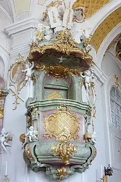 • Der Kanzelkorb ist mit Putten besetzt, die die Attribute der vier abendländischen Kirchenväter in den Händen halten: den Kardinalshut des Hieronymus, die Papstkrone Gregors des Großen, den Bienenkorb des Ambrosius und den Löffel, mit dem ein Junge dem heiligen Augustinus zu verstehen gab, dass es ebenso unmöglich sei, das Meer auszuschöpfen wie Gott zu ergründen. Auf dem Schalldeckel sind die Symbole der Evangelisten dargestellt: der Stier des Lukas, der geflügelte Mensch des Matthäus, der Adler des Johannes und der Löwe des Markus.