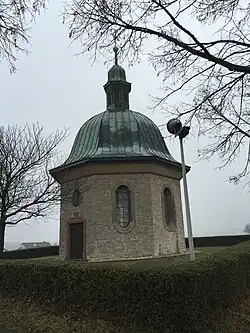 Links und rechts vom Kapelleneingang hängen drei Steintafeln, auf denen die Namen der Gefallenen und Vermissten der Gemeinde aus dem Ersten und Zweiten Weltkrieg eingemeißelt sind.[1] Diese verliehen der Kapelle im Volksmund auch den alternativen Namen Kriegergedächtniskapelle.