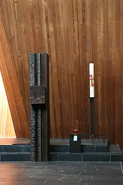 Malin schreibt zur Chorgestaltung: „Ganz augenfällig steht der Altar in der ideellen Mitte des Raumes. Die Architektur versammelt hier alle Mittel, um die Aussage zu unterstreichen: der Raum ist hier geweitet, das Licht fällt auf den Altar hin, die Linien, welche die Nahtstellen der verschiedenen Holzflächen zeichnen, verweisen auf den Altar.“[22]
