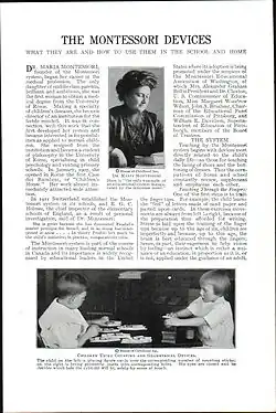 Aus den in dieser Zeit gemachten Erfahrungen entwickelte sie die Montessori-Methode (Il metodo della pedagogia scientifica, erste Fassung 1909, danach ständig erweitert, und L’autoeducazione, 1916) zur Erziehung von Kindern, die heute in vielen Teilen der Welt populär geworden ist. Nach einer Begegnung Montessoris mit Italiens Faschistenführer Benito Mussolini wurde 1924 die Montessori-Methode an italienischen Schulen eingeführt. Durch diese Protektion wurde die italienische Montessori-Gesellschaft von der faschistischen Regierung unterstützt. 1927 wurde diese Unterstützung noch verstärkt.[7] Die Entfremdung Montessoris gegenüber der faschistischen Regierung setzte 1934 ein, als das Regime immer mehr versuchte, sich in die tägliche Arbeit an den Montessori-Schulen einzumischen, beispielsweise im Gebot des Uniformtragens.[8] Nachdem die Montessori-Pädagogik verboten und 1936 die Montessori-Akademie in Rom geschlossen worden war, verließ Montessori 1939 Italien.[9]