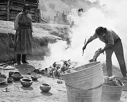 María und Julián Martinez beim Brennen schwarzer Keramik im San Ildefonso Pueblo (P'ohwhóge Owingeh), ca. 1920