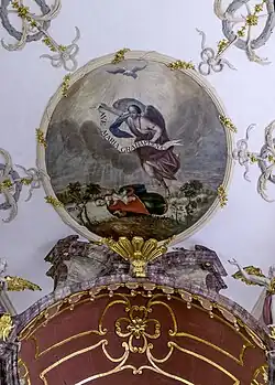 Älter ist das Deckenbild im Chor. Zwischen frühklassizistischem Stuck zeigt es die Gründungslegende: Ein Engel grüßt mit „AVE MARIA GRATIA PLENA – Gegrüßet seist du, Maria, gnadenvolle“ die Madonnenskulptur, die im Bleichbach (der Name „Bleich“ ist ins Wasser geschrieben) schwimmt. Hermann Ginter hat das Bild dem Freiburger Maler Johann Pfunner zugeschrieben.[4]