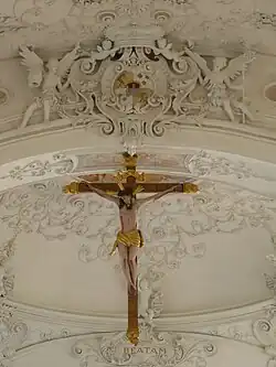 Das Langhaus der Kirche besteht aus einem Saal mit vier Fensterachsen und flachem Tonnengewölbe. Gegliedert ist das Langhaus durch ein kräftiges umlaufendes Gebälk. Dieses ruht im Langhaus auf Pilastern und im Chor auf Kapitellkonsolen. Eine Doppelempore befindet sich an der Westseite des Langhauses. An das Langhaus schließt sich der nahezu quadratische Chor an. Dieser ist im weiteren Verlauf in Richtung Osten halbrund geschlossen. Der halbrunde Chor ist zweigeschossig. Im Obergeschoss befindet sich der obere Hochaltar. Das Untergeschoss enthält die Sakristei mit einer Flachdecke. Der Treppenaufgang zum Obergeschoss befindet sich an der Nordseite der Sakristei. Die Sakristei ist mit zwei stichbogigen Türen rechts und links des Altars mit dem Chor verbunden. Die beiden Türen sind mit Voluten und Gebälkstücken bekrönt. Die südliche der beiden Türen könnte noch aus dem Vorgängerbau stammen. Im Chor ist eine Flachkuppel vorhanden. Das Langhaus und der quadratische Chor sind mit einem Satteldach, der halbrunde Chorschluss ist mit einem Mansarddach gedeckt. Die westliche Fassade ist durch Pilaster gegliedert. Der restliche Außenfassade besitzt aufgemalte Pilaster. Der Giebel der Westseite ist mehrfach geschwungen mit aufgesetzten Kugeln. Bekrönt wird der Giebel durch ein kleines, aus zwei Geschossen bestehendes Türmchen mit Ecklisenen. Das Türmchen ist mit einer, im unteren Bereich gebauchten, Haube mit geschweifter Spitze gedeckt.