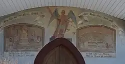 Ergänzend zu diesen Arbeiten hat Dominik Weber auch die Eingangsfassade der Kapelle bemalt. Zentral über dem Portal zeigt sich der Erzengel Michael als Seelenwäger mit einem Spruch nach Offenbarung 14, 13: „Selig sind die im Herrn sterben, ihre Werke folgen ihnen nach“. Links davon ist der Innenraum einer Kirche dargestellt und unterschrieben: „Du findest hier das Leben, Das Gott dir dort wird geben“. Entsprechend lautet rechts der Text zur Abbildung einer Apotheke: „Es hilft zuletzt kein Medecin, Wilst ein Arzney? geh‘ dorten hin“.