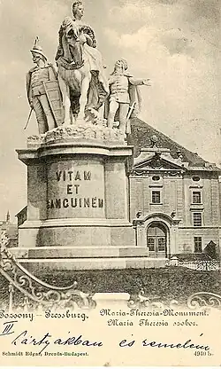 - ↑ Maria Theresia ließ sich am 25. Juni 1741 in St. Martinsdom zu Preßburg zur Königin von Ungarn krönen. Die St.-Stephans-Krone wurde ihr vom Fürstprimas von Ungarn und Erzbischof von Gran Emmerich Esterházy aufs Haupt gesetzt. Palatinus Graf Johann Pálffy assistierte bei der Krönung. (zitiert nach Anton Klipp: Preßburg, Neue Ansichten zu einer alten Stadt. Karlsruhe/Stuttgart 2010, ISBN 978-3-927020-15-3, S. 76f).