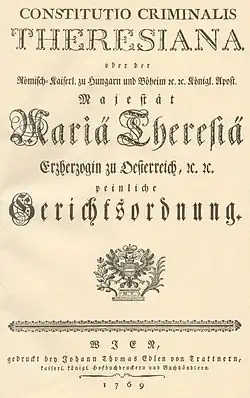 In Maria Theresias Zeit fielen bedeutende Reformen des Justizwesens. Die Organisation des Reichshofrates wurde verbessert und die Monarchin schuf ein Höchstgericht, dessen Aufgabe es war, das Recht in den österreichischen Landen aufrechtzuerhalten. Die Patrimonialgerichtsbarkeit der Grundherren wurde stark eingeschränkt, ebenso die Kompetenzen vieler Stadtgerichte.[23] Der Zentralisierung des Staates entgegen standen die unterschiedlichen Formen der Rechtsprechung in den verschiedenen Territorien. Maria Theresia ließ die Rechte der Länder im 1769 veröffentlichten Codex Theresianus sammeln. Auf dieser Grundlage sollte eine Rechtsvereinheitlichung vorgenommen werden. Sie führte mit der Constitutio Criminalis Theresiana erstmals ein einheitliches Strafrecht für alle Habsburger Länder – ausgenommen Ungarn – ein. Inhaltlich war es ganz vom überkommenen Recht geprägt. Aufklärung oder Naturrecht spielten noch keine Rolle. Erst 1776 unter dem Einfluss ihres Sohnes Joseph wurde die Folter abgeschafft.[21]