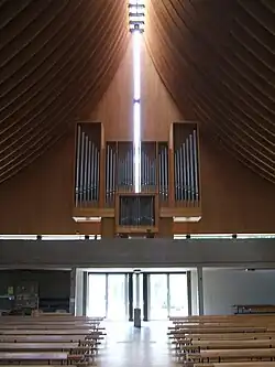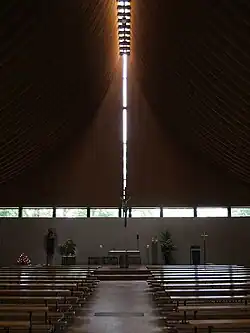 Der moderne Langbau hat ein nach oben geschwungenes Dach. Die Stahlbetonteile nehmen den Schub der verleimten Holzdachbinder auf, die nicht tragenden Wandplatten sind an den Stützen befestigt. Die Traufhöhe beträgt 5,30 m, die Höhe des Firstoberlichts 17,50 m. Der Grundriss ist nahezu ein Quadrat von 30 auf 30 m. Durch die Konstruktion konnten die Baukosten gesenkt und die Bauzeit verkürzt werden. Die Baustoffe sind so gewählt, dass sie in Zukunft keiner Verschönerungsanstriche bedürfen und wie bei alten Kirchen durch Patina eher gewinnen.