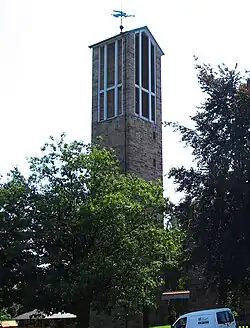 Der freistehende Glockenturm der Kirche hat eine Höhe von 33,40 m. In ihm befindet sich ein Geläut, bestehend aus 5 Glocken, das 1960 von der Saarlouiser Glockengießerei (Fraulautern) gegossen wurde. Die Saarlouiser Glockengießerei wurde 1953 von Karl (III) Otto aus Bremen-Hemelingen und Alois Riewer aus Geislautern gegründet und bestand bis 1960. Die erste Ausführung der größten Glocke („Christusglocke“) hatte einen Sprung und musste 1965 nachgegossen werden. Dafür zeichnete Karl (III) Otto von der Glockengießerei Otto verantwortlich.[7][8] Bei dem Bau des Turmes wurde ein Glockenstuhl aus Metall montiert, der starr mit dem Mauerwerk verbunden war. Dadurch entstanden Probleme, weil die Schwingung der 2. Glocke mit der Eigenresonanz des Turmes fast identisch war. Deshalb wurde der Turm von 2008 bis 2009 einer umfangreichen Renovierung unterzogen, bei der ein neuer Glockenstuhl aus Eichenholz eingebaut und die Schwingungszahl der kritischen Glocken angepasst wurde. Darüber hinaus wurde auch eine Betonsanierung des Turms durchgeführt und das Dach erhielt eine neue Eindeckung.[9]