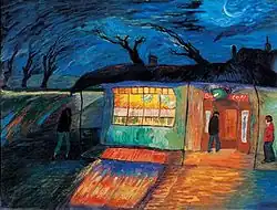 Bis in Werefkins Alterswerk lassen sich Reflexe auf die japanische Holzschnittkunst verfolgen. So kamen Mitte der 1920er Jahre mit einem Mal wieder Schlagschatten in Gebrauch, zum Beispiel ausgeprägt in dem Gemälde L’équipe de nuit[41] von 1924/25 oder in ihrem Bild Ave Maria[42] aus der Zeit um 1927. Sie dürften eine Rückbesinnung auf Vorbilder u. a. von Hiroshige[43] zu erklären sein. Auch die Prozessionszüge Kreuzweg I und Kreuzweg II[44] von 1926/28 kommen ohne japanische Vorlagen, etwa von Kawanabe Kyōsai[45] (1831–1889) nicht aus. Ebenso könnten die Monster in dem Bild Der Sieger[46] von 1930 auf Darstellungen mit Ungeheuern aus dem „japanischen Geisterkult“[47] z. B. von Utagawa Kuniyoshi,[48] zurückgehen.