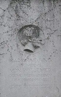 Marianne von Willemer erlag 76-jährig am 6. Dezember 1860 einem Herzschlag und wurde im Grab der Familie Andreae auf dem Frankfurter Hauptfriedhof beigesetzt.