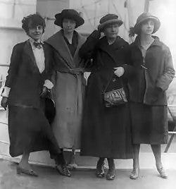 Am 4. Mai 1921 ging Marie Curie gemeinsam mit ihren beiden Töchtern und in Begleitung von Marie Meloney an Bord der Olympic.[66] Sieben Tage später traf sie in New York City ein, wo sie von einer großen Menschenmenge begrüßt wurde. Über ihre Ankunft berichtete die New York Times auf ihrer Titelseite unter der Schlagzeile Madame Curie hat vor, dem Krebs ein Ende zu bereiten.[67] Curies Entgegnung, dass „Radium kein Heilmittel gegen jede Art von Krebs“ sei, brachte die New York Times hingegen erst auf Seite 22.[68] Während ihres Aufenthaltes wurde ihre Rolle als Wissenschaftlerin in den Hintergrund gerückt und sie vornehmlich als „weibliche Heilende“ dargestellt.[69] Marie Curie besuchte zunächst verschiedene Frauencolleges, die für sie im Rahmen von Meloneys Kampagne gespendet hatten. Höhepunkt war eine am 18. Mai von der American Association of University Women organisierte Veranstaltung, bei der sie vor 3500 Frauen sprach.