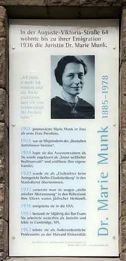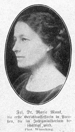 Nachdem in der Weimarer Republik auch Frauen zu den juristischen Staatsexamina zugelassen wurden, absolvierte Marie Munk diese und wurde 1924 Referentin des Preuß. Justizministers, jedoch wenige Monate später auf Grund der desolaten Haushaltslage wieder entlassen. Als eine der ersten Frauen in Deutschland bekam sie 1924 die Anwaltszulassung. Im Jahre 1929 wurde sie – seinerzeit „eine der bekanntesten Advokatinnnen [sic]“ in Berlin – zur Zivilprozessrichterin am Amtsgericht Charlottenburg ernannt.[3]