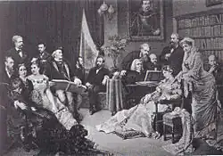 Richard Wagner im Kreis seiner Freunde in der Villa Wahnfried. Gemälde von Georg Papperitz, vor 1883. Links Cosima und Richard Wagner, am Flügel Franz Liszt, Vierte von rechts Mimi Schleinitz