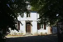 2-geschossiges, verputztes Wohnhaus mit Mansarddach, abgesetztem Sockel und einem niederen, satteldachgedeckten Treppenhausanbau in der Mitte der rückwärtigen Langseite; Fenster stichbogig, Werksteingewände, teilweise gefalzt, betonte Keilsteine; Gebäudeecken durch verkröpfte Lisenen betont, Hauptfassade mit flachem Mittelrisalit, in diesem der stichbogige Eingang mit Oberlicht, originalen Türblatt und profiliertem Sandsteingewände, Wappenkartusche im Keilstein; das Wohnhaus liegt aus der Fluchtlinie weit zurück und wird beidseitig von 1-geschossigen Backsteingebäuden flankiert, die den so entstandenen Hof einrahmen; zur Straße Einfriedung aus dem Ende des 19. Jh., mit Backsteinpfeilern und einem dazwischen liegenden Gitter, zugehörig ein großer Garten.