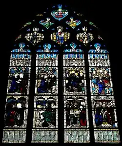 Das Fenster mit vier Lanzetten zeigt verschiedene Szenen aus dem Leben Mariens. Im Maßwerk sind die Madonna mit Kind, zwei Heilige und zwei Engel dargestellt.