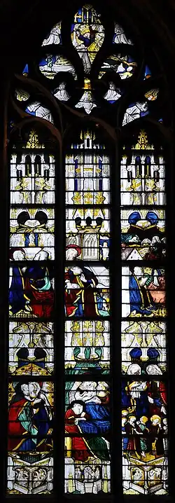 Das Fenster mit Szenen aus dem Leben Mariens wurde von König Ludwig XI. gestiftet. Oben von links nach rechts: Anna und Joachim beten im Tempel, die zurückgewiesenen Opfer und die Ankündigung der Geburt Jesu durch einen Engel an Anna und Joachim. Unten von links nach rechts: Begegnung an der Goldenen Pforte, Geburt Mariens, Maria Cleophas und Maria Salome (siehe auch Heilige Sippe) mit ihren Söhnen.