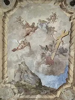 Das Deckengemälde zeigt in einem Scheinarchitekturrahmen den offenen Himmel mit der Dreifaltigkeit und Engeln, die das Kreuz tragen. Am altarseitigen Bildrand ist ein Stück Erdboden zu sehen. Dort lehnt an einer niedrigen Säule die Personifikation der katholischen Kirche, eine kindliche Gestalt, die mit Tiara, Albe und Pluviale bekleidet ist und den eucharistischen Kelch mit darüber schwebender Hostie in Händen hält; hinter ihr erscheint das Papstkreuz.