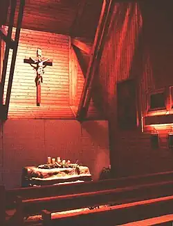 Die neue Kapelle ist vollständig aus Holz errichtet. Die auskragende Chorwand im Westen und die Oberlichter im Osten bilden innen eine Art Lichtschacht, in dem das Kruzifix und der Altar (aus Jurakalk) stehen. Der Kapellenraum mit den naturbelassenen Holzwänden ist auf diese Weise stimmungsvoll indirekt beleuchtet.