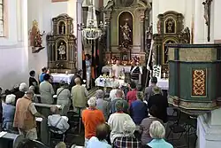Im Jahr 2015 erstellte das Landesamt für Denkmalpflege ein Gutachten über den Zustand der Altäre. Als problematisch hatten sich die verschiedenen Holzarten (Tanne und Eiche) erwiesen, aus denen sie gebaut sind und die in unterschiedlicher Weise „arbeiten“, sodass sich Risse bildeten und Farbe abblätterte. Hinzu kam Holzwurmbefall. Zuerst wurde daraufhin 2017 der rechte Seitenaltar abgebaut und restauriert, 2019 folgten der linke Seitenaltar und der Hauptaltar. Auffallend ist die gegenüber vorher hellere farbliche Fassung insbesondere des Hochaltars mit marmorierten, hellgrauen Flächen links und rechts der großen Nische mit der Madonna.[6]