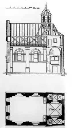 Die Kapelle ist ein verputzter Bruchsteinbau mit eingezogenem, nach Westen ausgerichtetem Chor, neben dem sich im Erdgeschoss die Sakristei und ein Oratorium befinden. Der Innenraum der Saalkirche ist einschließlich Chor etwa 13 Meter lang und im Bereich des Kirchenschiffs mit flacher Holzdecke 7 Meter breit. Den etwa 3,5 mal 3,5 Meter großen Chor schließt nach oben ein Kreuzgratgewölbe ab. An den Chorflanken befinden sich zwei Treppentürme, die die Dachfläche nur minimal überragen. Über die Treppen sind die zu beiden Seiten des Chores erhöht liegenden Patronatslogen der Stifterfamilie und die über dem Chor liegende Klausnerstube erreichbar. Das schiefergedeckte Hauptdach trägt einen sechseckigen, vollständig verschieferten Dachreiter. Den Eingang bildet ein rundbogiges Portal.[1][5]
