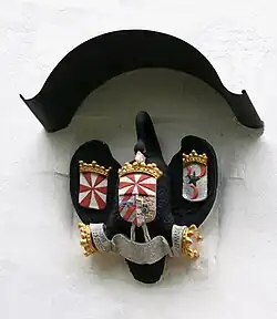 Über dem Portal hält ein schwarzer Schwan oder Pelikan, das Wappentier der Waldbotts, drei Wappen. Vom Betrachter aus links bzw. auf dem rechten Flügel ist das Wappen des Vaters von Lothar Waldbott zu sehen, gegenüber das Wappen der Mutter. Das Allianzwappen in der Mitte, das sich über allen Fenstern wiederholt, ist dreigeteilt. Oben zeigt es das Wappen Lothar Waldbotts, links darunter das Wappen seiner 1651 verstorbenen ersten Frau Johanna Walburga von Reiffenberg und rechts das der zweiten Frau Anna Magdalena, geb. Gräfin von Metternich-Winneburg-Beilstein, gestorben am 19. Januar 1693.[1][3]