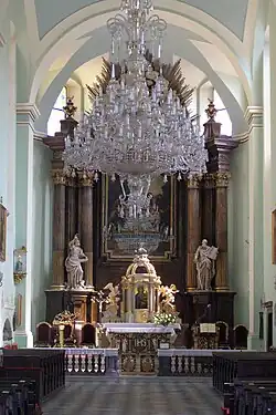Der barocke Hauptaltar stammt aus dem Jahr 1794 und wurde gefertigt von Andreas Schweigel, das spätklassizistische Tabernakel stammt aus der ersten Hälfte des 19. Jahrhunderts. Von dem Troppauer Bildhauer Franziskus Schubert sind die spätbarock-klassizistische Kanzel und der Taufstein. Bemerkenswert sind weiterhin das gotische Grabmal Przemislaus I. aus der Werkstatt von Peter Parler und das manieristische Epitaph des Ritters Mikołaj Rucki von 1664.[2]