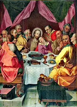 Das Hauptgeschoss ist in drei Bildfelder unterteilt, wobei das mittlere Feld breiter ist als die beiden seitlichen und als Hauptbild das letzte Abendmahl nach einem Stich von Johann Sadeler zeigt. Die beiden Seitenflächen enthalten je zwei mittelgroße quadratische Bilder, die übereinander angeordnet sind, und von denen jedes von einem Rahmen aus 16 kleinen Bildern umgeben ist. Diese vier Gemälde, einschließlich der jeweils zugehörigen kleinen Bilder, sind nach vier Stichen von Hendrick Goltzius von 1578 gefertigt. Die obere Hälfte der linken Seitenfläche ist Christus als Vorbild der Tugenden gewidmet, unten werden seine Wunder thematisiert. Auf der rechten Seite wird oben das Leiden Christi geschildert und unten geht es um seine Auferstehung. Die kleinen Bilder illustrieren jeweils acht biblische Geschichten aus dem Neuen Testament im Wechsel mit acht symbolischen Darstellungen aus Neuem und Altem Testament. Alle Überschriften und angegebenen Bibelstellen sind in lateinischer Sprache verfasst.