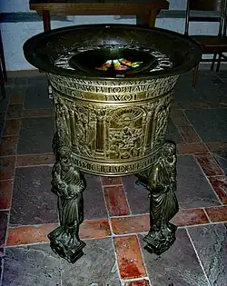 Die Bronzetaufe stammt aus dem Jahr 1591 und wurde von Michael Dibler aus Flensburg gegossen. Vier Figuren, die die Evangelisten Matthäus, Markus, Lukas und Johannes mit ihren Symbolen darstellen, tragen die Kuppa. Am Becken sind zwei Sätze in niederdeutscher Sprache angebracht: Latet de Kinderken to mi kamen wente sulker ist dat Himmelrieke und Wol gelovet unde gedoft wert schal salich werden. Darunter ist in acht Reliefs die Leidensgeschichte Jesu dargestellt. Den Anfang macht das letzte Abendmahl, gefolgt von der Fußwaschung Jesu bei seinen Jüngern, dem Gebet Christi am Ölberg und seiner Gefangennahme im Garten Gethsemane. Dann wird gezeigt, wie sich Jesus vor Kajaphas verantworten muss, gegeißelt und gekreuzigt wird. Die Szenenfolge schließt mit der Auferstehung Jesu Christi.[21] Der Deckel ist aus Holz geschnitzt, er sollte früher das Taufwasser vor Verunreinigungen schützen.