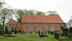 Die frühgotische Backsteinkirche wurde im 13. Jahrhundert als einschiffiger Apsissaal auf einer Warft errichtet. Um den Bau abzusichern, wurden Fundamente aus großen Granitblöcken (Findlinge) angelegt. Diese sind heute unter dem Glockenturm deutlich zu erkennen. Sie mussten mit großem Aufwand von weither geholt werden. In den Jahren vor 1500 wurde die Apsis an der Ostseite durch einen polygonalen, ehemals gewölbten gotischen Choranbau mit außen angebrachten Pfeilern in der Breite des Kirchenschiffs ersetzt.[1] Im Jahre 1787 wurde das Steingewölbe bei einer Renovierung durch eine Bretterdecke mit Voute ersetzt. Während der Baumaßnahmen wurden die kleinen romanischen Fenster an den Langseiten zu je vier schlichten Rundbogenfenstern vergrößert und die Portale an Nord- und Südseite zugemauert. An der Nordwand blieb ein ursprünglich kleines Rundbogenfenster, ein sogenanntes Hagioskop[2], vermauert erhalten.[1]