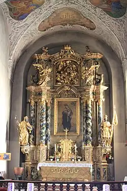 Der Hochaltar befand sich früher in der Antoniuskapelle und stammt von 1747. Er besitzt glatte und gedrehte Säulen, das Altarbild zeigt die Gottesmutter mit Kind und ist eine seitenverkehrte Kopie eines Stiches von Albrecht Dürer. Das Bild befindet sich seit 1706 in der Kirche. Die Seitenfiguren des Altares sind die hll. Antonius Eremita und Florian. Das Obergeschoß des Altars enthält ein Schnitzrelief der Vision des heiligen Johannes auf Patmos.
