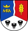 Beschreibung: Durch Göpelschnitt geteilt, oben durch eine silberne Wellenpfahlleiste gespalten von Blau und Rot; In Feld 1 ein goldenes Buchstabenemblem, gebildet aus den miteinander verbundenen Antiqua-Versalien M R A (Maria), darüber schwebend eine goldene dreizackige Krone; in Feld 2 ein goldenes stehendes Eichblatt; in Feld 3 in Silber drei zwei zu eins gestellte schwarze Stierköpfe.