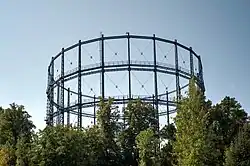 Der Gasometer Mariendorf (ugs.) liegt am südlichen Rand des Marienparks und ist einer von ursprünglich zwei errichteten Führungsgerüsten für Gasbehälter auf dem Gelände des früheren Gaswerks Mariendorf. Er wurde zwischen 1901 und 1902 errichtet und hatte ein Fassungsvermögen von 108.000 m³. Der zweite Gasometer, der die Rückbauarbeiten durch die GASAG nicht überstanden hat, besaß ein Fassungsvermögen von 150.000 m³.[4] Erstmals wurde der Gasometer Mariendorf zu Beginn der 1890er Jahre in Wien aufgebaut. Zum Ende des 19. Jahrhunderts wurde er dort nicht länger gebraucht, sodass die Imperial Continental Gas Association (ICGA) als Eigentümerin das Führungsgerüst nach Mariendorf verlegte.
