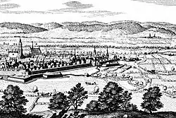 Die bekannte Stadtansicht aus Merians »Topographia Germaniae«, Band 15: »Herzogtum Braunschweig-Lüneburg«, Frankfurt am Main 1654 – zeigt diesen Friedhof und mit H markiert die Verschanzungen des Tiedexer Tores.