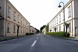 - ↑ Anmerkung: Das Gebäude rechts im Hintergrund ist der entkernte und umgebaute Überrest des rechten Flügels des Altgebäudes.