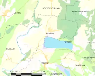 Zu Marigny gehören der Weiler Villard-sur-l’Ain (520 m) auf dem Plateau zwischen Ain und Lac de Chalain sowie einige Einzelhöfe. Nachbargemeinden von Marigny sind Montigny-sur-l’Ain und Mont-sur-Monnet im Norden, Fontenu im Osten, Doucier im Süden sowie Châtillon im Westen.