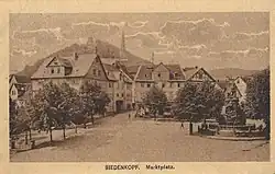 Der Marktplatz vor 1918, schon mit Kriegerdenkmal; Links die Hirschapotheke mit dem Ziegenberg