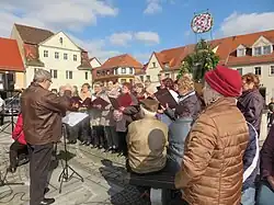 Der im Rahmen der Innenstadtsanierung neugestaltete Marktplatz wurde am 10. Dezember 1994 feierlich übergeben.[3] Der Marktbrunnen wurde nach einem Entwurf von Reinhard Pfennig errichtet und am 14. Oktober 1995 eingeweiht. Zuvor gab es eine Bürgerbefragung zur Entscheidung zwischen sechs Entwürfen, darunter einer von Bildhauer Jürgen von Woyski.[5] Eine Nachbildung der Kursächsischen Postdistanzsäule von 1732 wurde am 13. Oktober 2012 auf dem Marktplatz eingeweiht.[6]