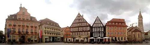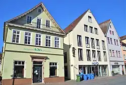 Die mittelalterliche, kleinparzellige Aufteilung der Bebauung hat sich über die Jahrhunderte erhalten. So hat zum Beispiel, der für das heutige Erscheinen des Platzes prägende, Stadtbaumeister Johann Michael Keller der Jüngere bei den barocken Neubauten häufig die Fundamente der Vorgängerbauten genutzt. Heute stehen die Mehrheit der Häuser am Platz unter Denkmalschutz. Die Gebäude verfügen hauptsächlich über drei Stockwerke und etwa dieselbe Höhe. Zumeist sind die Giebel zum Marktplatz ausgerichtet. Ebenfalls als Denkmäler eingestufte, hier nicht dargestellte Gebäude sind Marktplatz 2, 4, 5, 14 das über eine vollständig erhaltene Barocktreppe verfügt, 17–24, 26, 28–30, 32, 33 und 36.