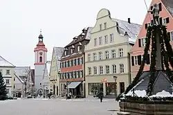 Weißenburg, 867 erstmals urkundlich erwähnt, entstand um einen karolingischen Königshof und erhielt im frühen 14. Jahrhundert den Status einer Freien Reichsstadt, den es bis 1802 behaupten konnte. Der Markt breitet sich als Rechteck an der Straßenachse aus, die nach Süden zum Spitaltor und weiter nach Augsburg führt. Im rechten Winkel dazu wurde in der Blütezeit der Stadt planmäßig der viel größere Holzmarkt (heutige Luitpoldstraße) angelegt. Eine dritte Hauptstraße (Ellinger Straße) stößt von Norden, von Nürnberg her, durch das Ellinger Tor in die Stadt, erreicht den Markt aber erst nach scharfer östlicher Abwinkelung (Rosenstraße).[1]