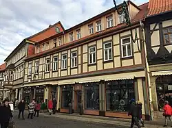 1558 wohnte in diesem Haus der Wernigeröder Bürgermeister Thomas Schütze. Daran erinnert noch heute beim Durchgang zum benachbarten Gebäude Marktstraße 1 die Kemenate von 1556.